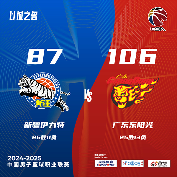 JRS直播网讯:北京时间3月10日,2024-2025赛季CBA常规赛第38轮迎来焦点比赛“疆粤大战”,新疆队主场迎战广东队,赵睿生涯首次战旧主。最终,广东队客场以106比87大胜新疆队19分。