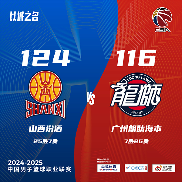 JRS直播网讯 北京时间1月20日讯 CBA常规赛,山西主场迎战广州,山西目前3连胜后24胜7负后排在第3位,广州则是4连败后7胜25负排在第18位。本场比赛,山西外援迪亚洛缺阵。山西上来就打出7-0开局,郭艾伦有攻有传带队迅速回应10-0反超,随后双方展开拉锯战,山西接连三分,郭艾伦连续助攻回应,首节广州领先4分,次节古德温带领球队追分,而广州外援麦考尔和道格拉斯能联手回应,郭艾伦继续串联的情况下,里突外投连续取分,双方比分持续胶着。下半场,双方继续胶着拉锯战,场上哨声频响两队很快都犯满,末段双方对攻,原帅有攻有传带队领先8分,末节原帅上来又是接连三分拉开双位数领先,郭艾伦有攻有传带队咬住比分,但张宁接连突破取分,古德温压哨三分杀死比赛,最终山西124-116力克广州,拿到4连胜同时送对手5连败。