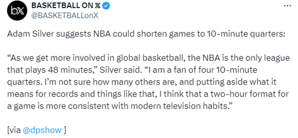JRS直播网讯 北京时间1月30日,NBA总裁亚当-萧华公开表示,他支持NBA把每节比赛时间改为10分钟,两个小时的比赛时长更符合现代电视节目习惯。