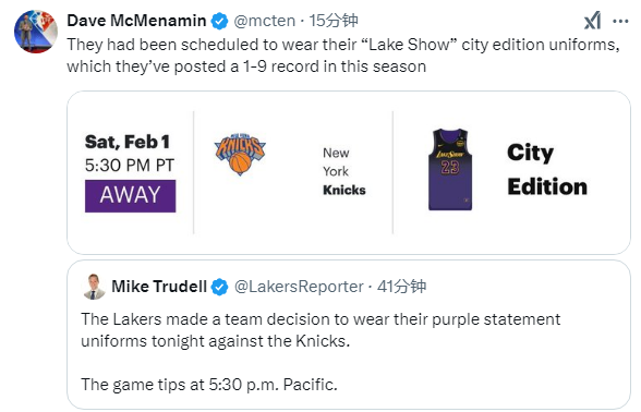 JRS直播网讯 北京时间2月2日,NBA常规赛湖人客场大战尼克斯,赛前湖人决定更换球衣,据湖人记者Dave McMenamin和Mike Trudell报道,湖人原计划身穿城市版球衣对阵尼克斯,但赛前湖人决定身穿紫色球衣,不穿“LakeShow”城市版球衣。