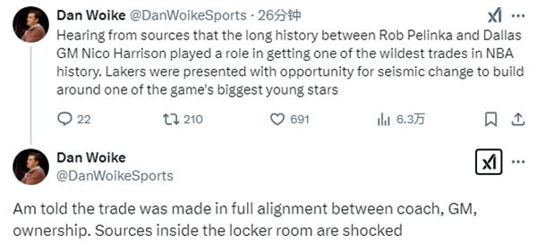 湖人随队记者Dan Woike报道,湖人GM佩林卡和独行侠GM尼克-哈里森促成了这笔NBA历史上最疯狂的交易之一,湖人有机会围绕着这个最出色的年轻球星之一进行彻底改变;这笔交易是教练、总经理和老板三方共同商定的,消息人士透露,球队更衣室内部人士对此感到十分震惊。