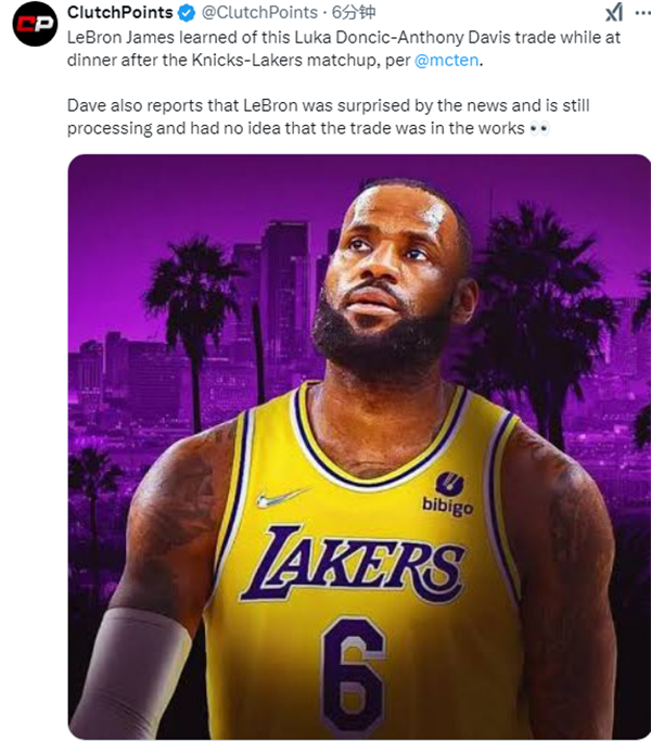 湖人记者Dave McMenamin表示,詹姆斯身边人士透露,詹姆斯在赛后与家人外出吃饭时得知了这一消息;消息人士透露,詹姆斯正在消化这一消息,而且他不知道交易的进行。