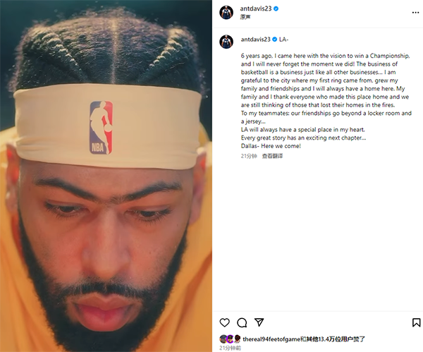 JRS直播网讯 北京时间2月4日,在湖人、独行侠和爵士三方大交易之后,安东尼-戴维斯首次发声,深情告别洛杉矶,却只字不提湖人,浓眉感谢洛杉矶以及致敬队友,却只字不提湖人。