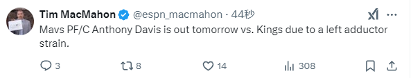 JRS直播网讯 北京时间2月10日,独行侠球星安东尼-戴维斯的伤情出炉,独行侠官方表示,浓眉因左内收肌拉伤将缺席明天与国王的比赛,恐因伤缺席全明星正赛。