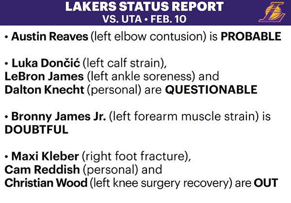 JRS直播网讯 北京时间2月10日,湖人官方公布下一场对阵爵士的伤病报告,詹姆斯和东契奇可能迎来首次合体,克内克特可能回归,ESPN预计东契奇明日复出迎湖人首秀,44岁名媛卡戴珊坦言想见卢卡。