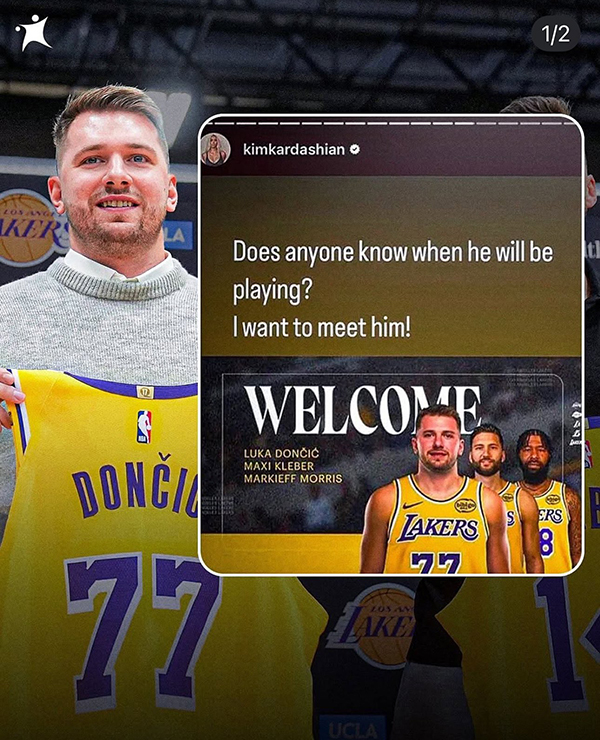 44岁的美国名媛金-卡戴珊可能会到场观看东契奇的湖人首秀,此前金-卡戴珊更新社媒,晒图写道:有人知道他什么时候会上场吗?我想见他!