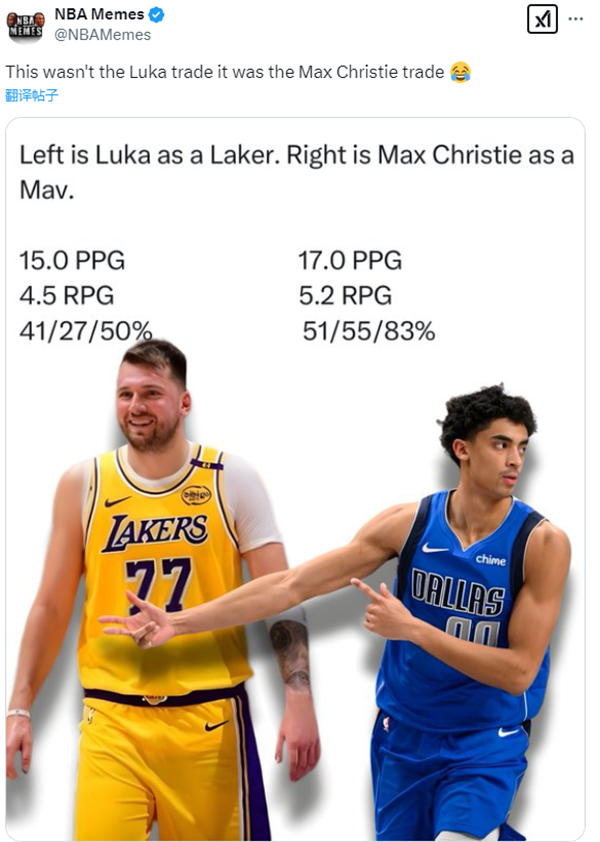 JRS直播网讯湖人旧将马克斯-克里斯蒂的出色表现引热议,自从被交易之后,22岁的克里斯蒂在独行侠队场均拿到17+5且效率很高,离开湖人后多项数据暴涨,美媒调侃东契奇才是交易添头。