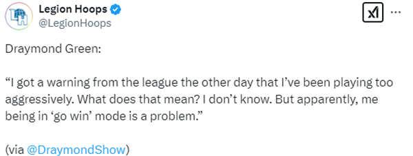 在自己最新一期播客节目中,格林表示自己收到了联盟的警告:前几天我收到了联盟的警告,说我打球时太有侵略性了。这是几个意思?我不懂。但显然,我处于‘全力争胜’的模式是个问题。