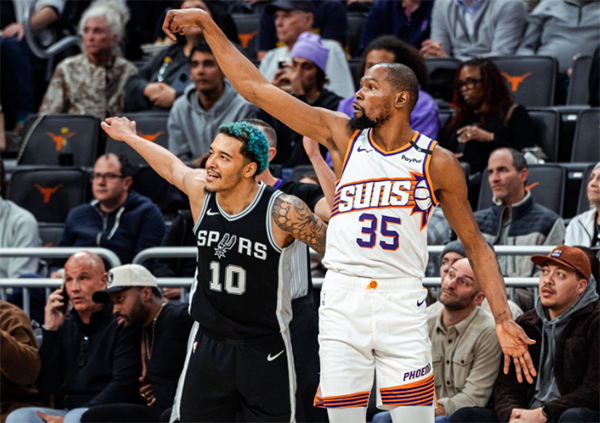 下半场,太阳第三节25-34又被马刺拉开分差,三节打完太阳落后15分;这一节杜兰特外线连中两记三分球,单节3投3中拿到9分,持球突破想要隔扣比永博,被犯规重摔倒地;布克单节4中2贡献6分还有3次助攻,无奈太阳又落后到两位数。