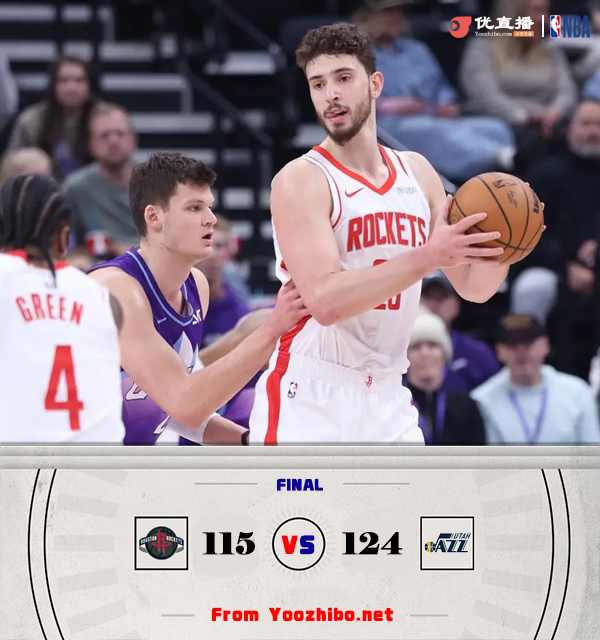 NBA常规赛,火箭以115-124爆冷不敌爵士。首节火箭落后1分,半场打完火箭 反超6分,三节打完爵士缩小到3分,末节爵士很快反超到12分,随后爵士爆冷击败火箭。此役后火箭35胜22负,湖人34胜21负,湖人反超火箭升至西部第四,火箭掉至西部第五。