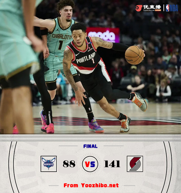 NBA常规赛,黄蜂对阵开拓者,黄蜂上场输给掘金,开拓者最近遭遇4连败,本场比赛艾顿和罗威都缺阵。开场没多久开拓者就在阿夫迪亚的带领下打出一波13-0的攻势建立领先,虽然黄蜂两记三分止血,但开拓者再度打出冲击力又将比分拉开,开拓者的外线也逐渐找到手感连中三分。第二节黄蜂进攻依旧打得不理想,鲍尔手感不佳,反观西蒙斯状态火热单节轰下15分帮助开拓者继续扩大优势,半场过后开拓者领先33分。易边再战,鲍尔的表现依旧不佳,开拓者则是全面开花将分差继续拉大,比赛彻底失去悬念,末节成为两队练兵时间,最终开拓者141-88血洗黄蜂结束4连败,黄蜂遭遇2连败了。