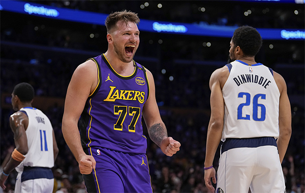大交易后湖人和独行侠首次对决,东契奇第一次身披77号紫金战袍大战前东家,东契奇开场接连送出助攻,湖人9-2开场领先,期间东契奇一打四上篮被犯规却没哨,不满判罚还吃到技术犯规,裁判如此吹罚引争议;比赛继续,面对独行侠的反扑,东契奇轰进三分以及造犯规罚球得分,第一节湖人28-20领先8分,东契奇首节7投3中拿到9分7篮板4助攻1抢断1盖帽。