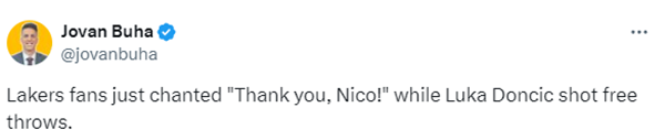 上半场,东契奇8投3中拿到12分12篮板7助攻2抢断2盖帽,执行罚球时,湖人主场球迷集体高呼:谢谢你,尼克-哈里森(独行侠总经理);詹姆斯半场9分6篮板出现5次失误。