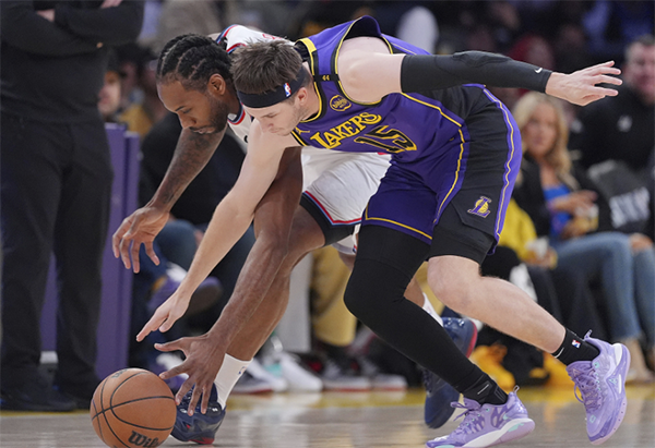 昨天湖人击败森林狼,八村垒因拉伤膝盖提前退出比赛,詹姆斯和海斯也遭遇小伤,不过老詹和海斯的伤势无碍;今日洛城德比,詹姆斯和海斯继续首发出战,八村垒因伤无法出战,第一节湖人又遭伤病打击。