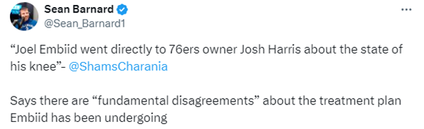 据名记shams报道,恩比德直接向76人老板乔什-哈里斯说明了自己的膝盖状况以及他对自己和球队最佳利益的认识,还有赛季报销的问题,恩比德和76人在治疗其膝盖问题上存在‘根本性分歧’;恩比德认为他需要采取不同的治疗方法,而 76 人队则希望他能继续带伤作战,调整出更好的状态,本赛季带着膝盖伤势继续打比赛。目前他们已经达成一致,关键是要让恩比德以最可持续的方式重返赛场。