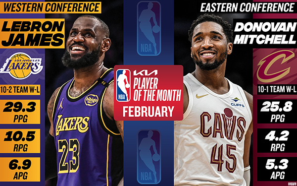 JRS直播网讯北京时间2025年3月5日,NBA官方公布了2月份的最佳奖项。湖人队的勒布朗·詹姆斯当选西部月最佳球员,这是他职业生涯第41次获得这一荣誉,刷新了NBA历史纪录。同时,骑士队的双星多诺万·米切尔和埃文·莫布里也分别荣获东部月最佳球员和东部月最佳防守球员。