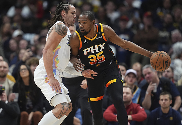 第二节,布克里突外投带队反扑缩小分差,可太阳才追到5分就陷入得分荒,被掘金打出20-8的进攻高潮,太阳瞬间落后到17分;杜兰特登场后命中三分以及突破扣篮,无奈半场打完,太阳56-68已经落后12分。