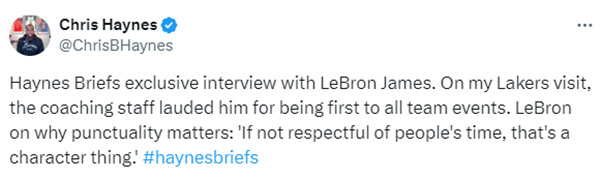 Haynes报道称,最近我跟队报道了一段时间的湖人,也与一些教练组成员聊过,他们向我分享了一件事,就是他们对于40岁的詹姆斯的惊讶,惊讶于他总是全队第一个去参加比赛、训练、录像会议的人,也是第一个到场登上球队包机的。