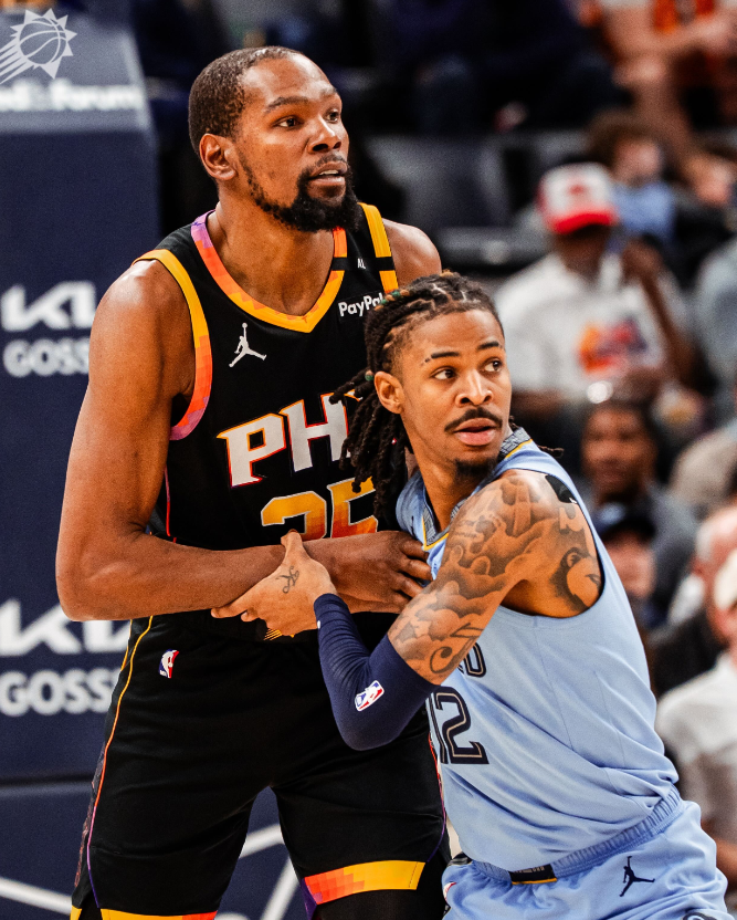 本赛季第四次大战灰熊,比尔因伤缺席比赛,杜兰特和布克继续带队出战,第一节太阳12-4开场领先,面对灰熊的反扑,杜兰特外线连中三分带队扩大优势;太阳25-9领先16分后进攻下滑,灰熊反扑缩小分差,首节打完太阳34-26领先8分,杜兰特首节打满12分钟,8中5、三分5中4独揽14分。