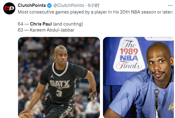 本赛季至今,保罗保持全勤出战,已经连续出战了64场比赛,因此保罗打破了贾巴尔(连续63场)的纪录,成为NBA历史上在生涯第20个或以后赛季连续出战场次最多的球员。
