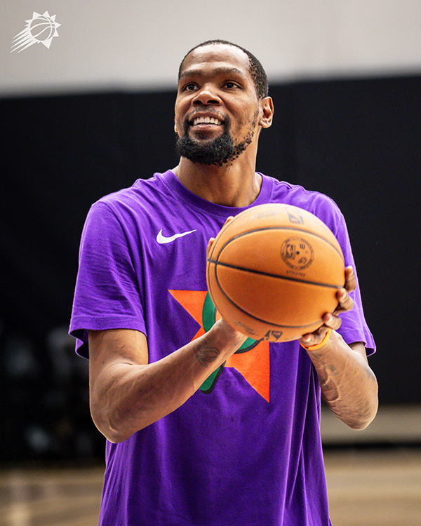 根据赛程,太阳下一场将在客场大战湖人,这将是两队本赛季第4次交手,杜兰特无缘大战詹姆斯(腹股沟拉伤),此前三次交手,太阳2胜1负;今日太阳官方晒出众将备战湖人的训练照,杜兰特身穿一件紫色训练T恤,面带笑容十分轻松。