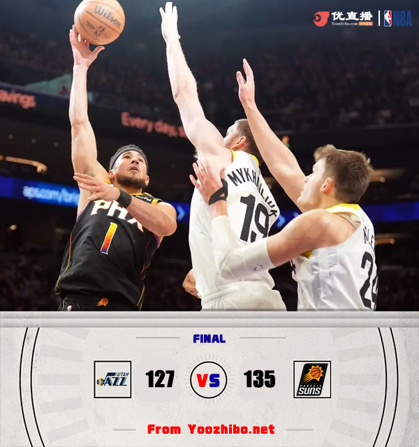 JRS直播网讯 北京时间2月8日讯 NBA常规赛,太阳主场迎战爵士。太阳3连败,以25胜25负排西部第9,爵士12胜37负西部倒数第2。比赛开始,布克高效输出,但爵士多点开花将分差拉开到两位数,次节太阳火力全开,布克里突外投连续得分,爵士命中率下降,太阳单节净胜10分,半场双方战成55平。易边再战,双方大打对攻,太阳火力更猛,布克手感滚烫第三节再拿10分,末节太阳占得先机将分差拉开到两位数,爵士奋力反击轰出13-0的攻击波扳平比分,双方争夺陷入白热化,关键时刻凯斯勒连续补篮拿分,科利尔压哨也有,阿伦三分绝平,将比赛拖入加时。加时赛,太阳连中三分轰出11-3的攻击波锁定胜局。最终,太阳135-127加时击败爵士,主场过关。