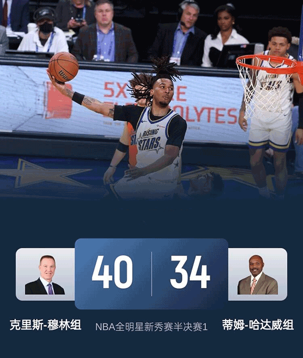 JRS直播网讯2月15日 NBA全明星新秀半决赛,克里斯-穆林组率先对阵蒂姆-哈达威组,比赛采用先拿到40分就获胜结束的赛制。比赛上来,克内克特就率先命中三分球,迪克则用上篮为哈达威组拿下首分,基昂特-乔治此后连拿八分帮助穆林组取得领先,克内克特的空切上篮将分差拉开到两位数,暂停回来后穆林组打得依旧出色,主场作战的TJD和克内克特相继送出暴扣,好在是哈达威组此后一波7-0完成止血,虽然迪克成为两队最先上双的球员,但穆林组这边全面开花,没有给对手反超的机会,凭借着卡斯尔的绝杀球,穆林组淘汰哈达威组。
