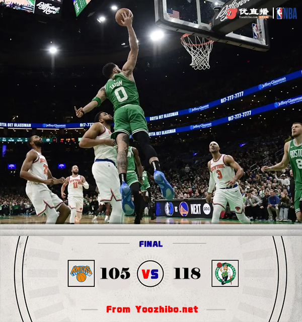 JRS直播网讯北京时间2月24日讯 NBA常规赛,凯尔特人主场迎战尼克斯,凯尔特人4连胜后40胜16负稳居东部次席,尼克斯则是37胜19负排在东部第3位。本场比赛,哈特迎来复出。比赛开始,绿军先发五虎都得分带队打出13-3不错开局,哈特和布伦森接连单打止血,但豪泽连续外线发炮,塔图姆接连突破还是领先到19分,次节佩恩连砍7分助队10-2迅速追分,波尔津吉斯攻防建功助队稳住局势,塔图姆干拔三分再中助绿军半场领先21分。下半场,唐斯反弹里突外投得分迅速上双,但双探花外线能回应,布伦森连砍12分助队打出23-5攻击波一度追到个位数分差,末节怀特接连三分助队稳住局势,唐斯受伤好在无碍,杰伦-布朗发力连砍11分带队重新拉开20分领先,最终凯尔特人118-105击退尼克斯,拿到5连胜。