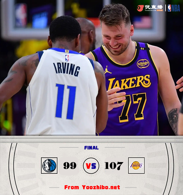 JRS直播网讯 北京时间2月26日讯 NBA常规赛焦点战,湖人主场迎战独行侠。这是东契奇和浓眉重磅交易后两队首次交锋,可惜浓眉本场因伤缺阵。湖人34胜21负西部第4,独行侠31胜27负西部第8。比赛开始,湖人率先发力打出9-2开局,欧文和东契奇接连外线对飚,随后里夫斯和八村塁又是接连三分命中,首节湖人领先8分,次节双方展开拉锯战,里夫斯接连三分单节得分上双,东契奇接连送助攻一度拉开16分领先,但湖人收内线策略效果不佳,克里斯蒂接连三分助独行侠半场追到差8分。下半场,双方展开拉锯战,湖人外线多个机会把握不住,欧文连砍7分继续带队追分,埃克萨姆接连中远投砍下5分追到差1分,末节克莱连续3记三分追平比分,东契奇上场和一攻一传助队稳住局势,欧文三分再追,但芬尼-史密斯和詹姆斯接连送补扣,湖人牢牢掌握住两球以上领先,最终湖人107-99力克独行侠,拿到3连胜。