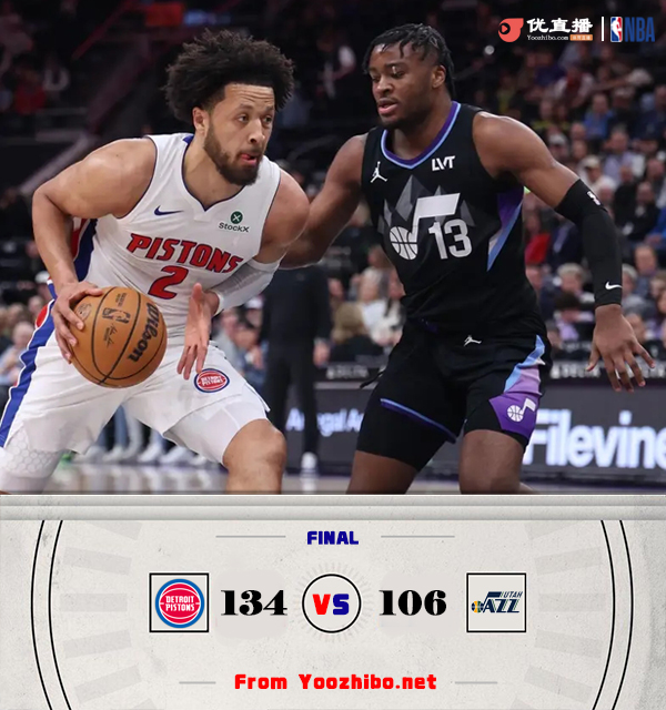 JRS直播网讯北京时间3月4日讯 NBA常规赛,活塞对阵爵士,活塞上场比赛轻取篮网稳居东部第六,爵士继续在西部垫底,上场输给鹈鹕。刚开场爵士在进攻端还打得有声有色,一度和活塞打得有来有回,但第一节后半段爵士失误开始增多,活塞多点开花迅速拉开比分,第一节爵士出现10次失误。第二节回来两队都先是选择冲击内线拿分,康宁汉姆得分组织一把抓,带领活塞再度掀起一波攻势将分差拉大到20分以上。易边再战,活塞在康宁汉姆的带领下攻势依旧不减,爵士也是多点开花紧追不舍。最后一节,塞克斯顿和菲利波夫斯基联手继续发起反扑,康宁汉姆和奥萨尔重新登场后帮助活塞再度将分差拉大到20分开外,比赛彻底失去悬念,最终活塞134-106大胜拿下爵士取得2连胜,爵士遭遇2连败。