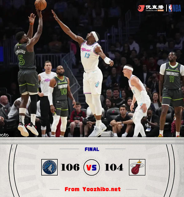 JRS直播网讯北京时间3月8日讯 NBA常规赛激战正酣,热火主场迎战森林狼,森林狼近期迎来三连胜,35胜29负紧追勇士位列西部第7,热火29胜32负排在东部第7。此役一上来双方便陷入缠斗,阿德巴约连投带罚不断取分,兰德尔联手康利及时回应,森林狼中段开始发力确立优势,首节结束时森林狼领先8分,次节回来,森林狼始终保持领先,但末段他们进攻突然断电,热火顺势抹平分差,半场战罢,两队战成52平。易边再战后森林狼再度发力将分差拉开到两位数,阿德巴约和希罗内外结合强势回应,双方战成80平进入末节,末节决战,两队鏖战至最后时刻,里德和麦克丹尼尔斯连中抛投,森林狼连丢罚球后阿德巴约三分绝杀未果,最终森林狼106-104涉险过关。