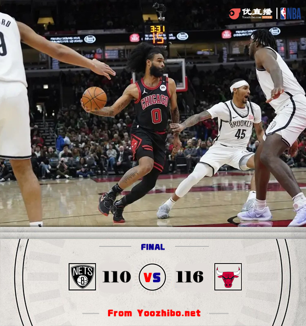 JRS直播网讯 北京时间3月14日讯 NBA常规赛,公牛主场迎战篮网。公牛3连胜后27胜38负东部第10,篮网则是22胜43负东部第12。本场比赛,基迪缺阵。比赛开始,双方都迅速进入比赛状态,托马斯上来先串联球队,泰瑞斯-马丁单节3记三分得分上双,而怀特接连突破回应,比分持续胶着,次节托马斯开始接管进攻单节12分,特雷-琼斯里突外投一度助公牛扩大领先,但托马斯一攻一传助篮网半场领先3分。下半场,半节时间篮网打出9-2小高潮一举拉开双位数领先,怀特带队追分,双方围绕着10分左右领先展开拉锯战,末节篮网又断电半节仅得3分,公牛15-3攻击波一度反超,双方比分持续胶着,许尔特连续两次打拉塞尔关键上篮2+1领先到8分,最终公牛116-110逆转篮网,取4连胜。
