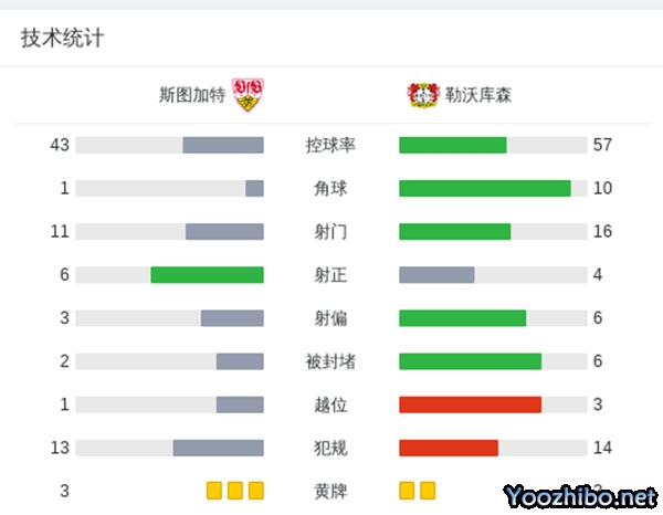 最终斯图加特3-4勒沃库森。积分榜方面,勒沃库森落后拜仁6分,斯图加特37分第十。