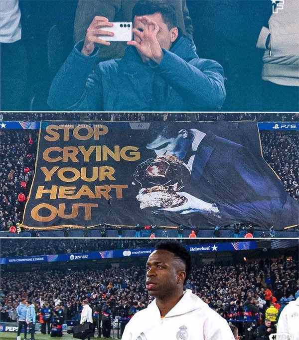 众所周知,因为去年的金球奖与罗德里的竞争屈居第2,维尼修斯本场比赛赛前,受到了主场的曼城球迷特别的礼遇,曼城球迷拉出巨型TIFO,上面甚至写着“停止哭泣”来嘲讽维尼修斯。不仅如此,比赛中,曼城球迷还高声歌唱“你的金球奖在哪”,来嘲讽维尼修斯。
