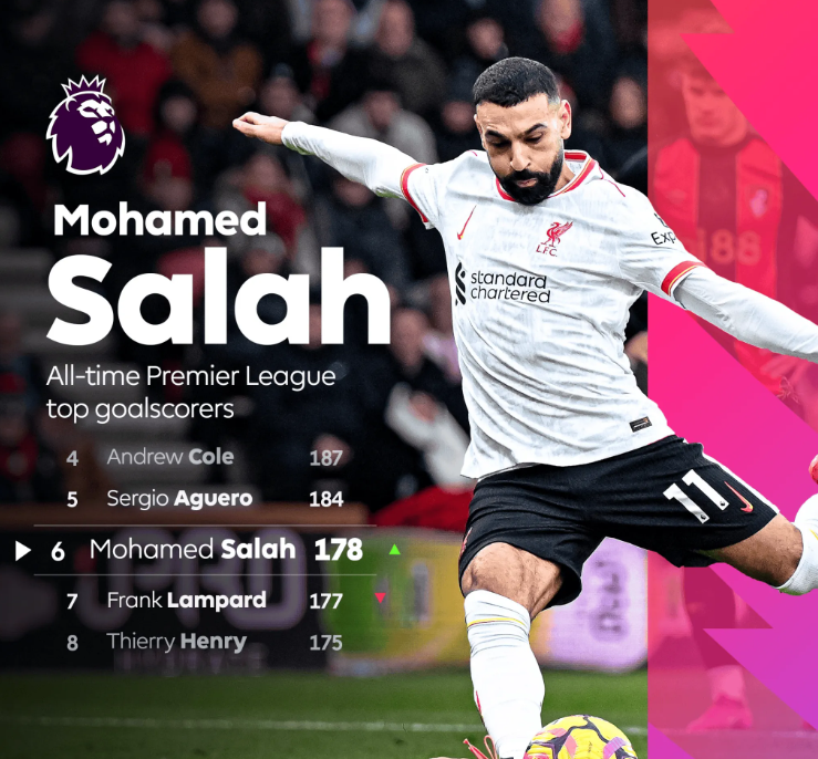 这粒进球是萨拉赫在英超中打进的第178粒进球,超越了切尔西名宿兰帕德(177球),独享英超历史射手榜第6。不过,萨拉赫的出场次数比兰帕德少了323次。
