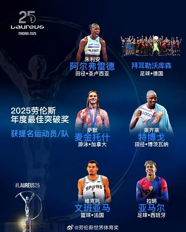 JRS直播网讯官方消息,2025劳伦斯世界体育奖“年度最佳突破奖”提名,勒沃库森、亚马尔、文班亚马入围,去年这一奖项的获奖者是英格兰足球运动员贝林厄姆。