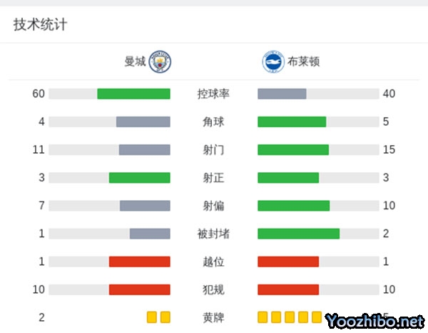 最终曼城2-2布莱顿,英超两轮不胜,先赛1场距前四1分。