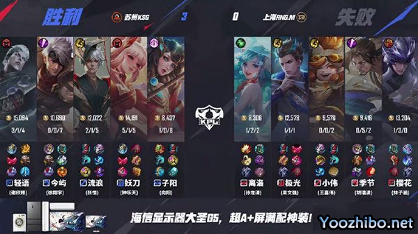 第三局,KSG三把都保持自己的节奏一点一点把RNGM逼退,经济差逐渐拉大后最后一波被压在水晶内,KSG点掉水晶连赢三局,拿下了本场胜利!本局MVP为苏州KSG妖刀(钟乐天)公孙离!