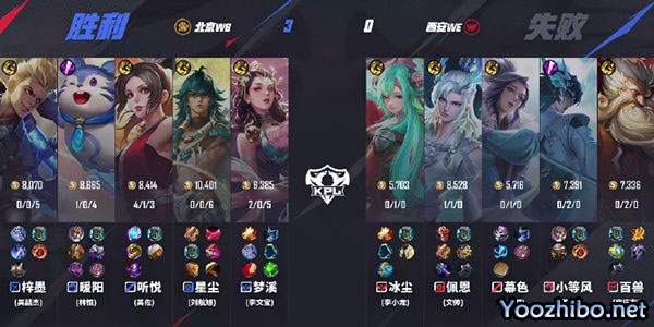第二局,WB中辅的combo接的非常好,太乙和西施开团拆火;大司命和孙尚香发育很好,经济差拉的很开,WE正面根本扛不住;最后一波星尘的孙尚香三杀,WB先到赛点。本局MVP为北京WB听悦 (吴佐)西施!