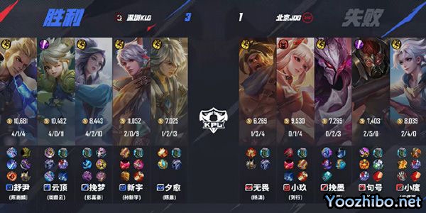 第三局,JDG多次主动进攻,KLG前期陷入被动防守局势,但稳住节奏,打出防守反击。JDG阵型脱节,鲁班七号掉点走位失误,KLG彻底翻盘,拿下这一小局胜利。本局MVP为深圳KLG舒尹 (陈雨麟)姬小满!
