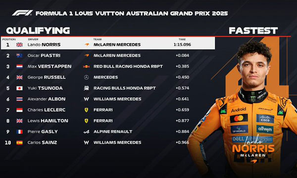 Q3阶段,诺里斯以1分15秒096位居第一摘得新赛季首个杆位,主场作战的皮亚斯特里以0.084秒的劣势屈居第二,迈凯伦两车正赛将头排发车,维斯塔潘1分15秒481位居第三。效力于小红牛的日本车手角田裕毅则是在最后时刻杀至第5位。