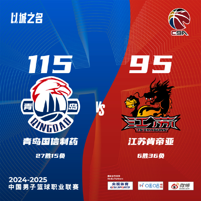 JRS直播网3月19日讯 CBA常规赛,青岛主场迎战江苏。青岛26胜15负排在联赛第9,江苏6胜35负联赛垫底。一开场,江苏打出8-3的开局,青岛轮番冲击篮筐频频得手迅速扳平比分,此后双方陷入缠斗,青岛持续发力打出10-0的攻击波确立两位数优势,江苏不断杀入内线拿分努力追赶,半场战罢青岛63-54领先江苏。下半场,青岛攻防两端压制对手,一举将分差拉开到20分以上,末节青岛稳扎稳打将优势保持到最后,最终,青岛115-95大胜江苏,送给对手8连败。