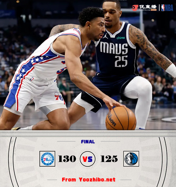 JRS直播网讯3月17日讯 NBA常规赛激战正酣,独行侠主场迎战76人,两队本赛季均遭遇伤病潮,76人遭遇3连败,22胜44负位列东部第12位,独行侠连败后战绩来到33胜35负,排在西部第10位。此役一上来格莱姆斯联手亚布塞莱不断取分,席菲诺替补登场连中三分,华盛顿连造杀伤单节14分及时止血,首节结束时76人领先4分,次节回来,独行侠众将找到进攻感觉,多点开花的他们一举反超,半场战罢,独行侠后来居上领先4分。易边再战后双方你来我往火热对攻,格莱姆斯延续火力予取予求,三节结束后76人反超确立12分优势,末节上来,丁威迪联手克莱率队追分,决胜时刻丁威迪仓促绝平未果,76人连中罚球后独行侠回天乏术,最终76人130-125力克对手。