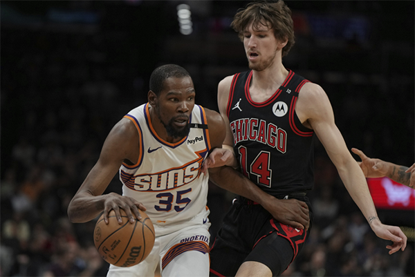 太阳主场127-121击败公牛,再加上独行侠惜败步行者,因此太阳(33胜37负)凭借微弱的优势反超独行侠,升到西部第十,终于杀到附加赛区;今日一战,布克全场拿到41分7助攻4篮板,杜兰特15中8高效拿到26分8助攻4篮板。